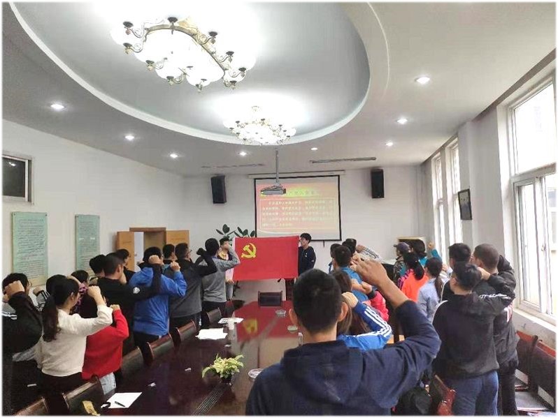 ▲党员们佩戴党徽上课