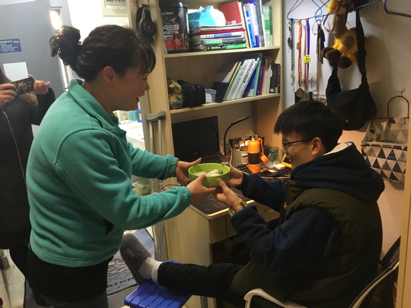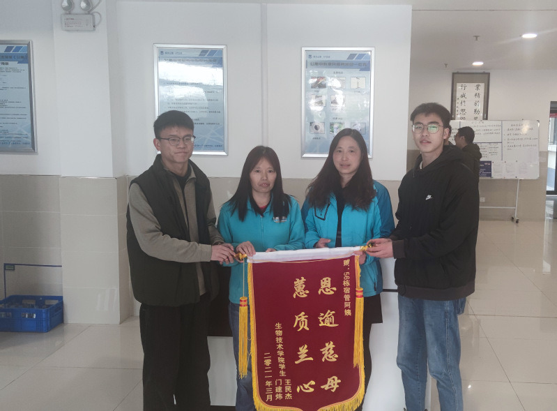 王民杰是2019级生物工程专业学生。打球不小心伤到了腿拄起了拐杖后,他从门口进去的时候被宿舍阿姨看到了。“我也没太在意,因为我们一栋宿舍楼有上千人,我以前一直认为这么多人宿管阿姨只能做到最基础的查按时归寝,但是让我没有想到的是宿管阿姨不仅能记到我的寝室号,还能记得我是生物技术学院的学生。当阿姨查寝的时候给我端了一碗萝卜排骨汤过来,我心里既惊讶又感动,宿管阿姨叫我好好休息,并且还很温柔的没有扣我卫生分,说我受伤了不方便收拾,十分的有人情味。” 2018级生物工程专业的门建炜介绍,当时阿姨第一时间询问自己的病情,第二天一早端着连夜煲的爱心排骨汤来到宿舍慰问,还说“刚刚给你热好了,你快趁热吃,明天我继续热好了给你拿过来,这段时间你就好好养伤,有什么不方便的及时和阿姨讲”。阿姨叮嘱让身处异地的门建炜感受到了无微不至的关怀。“就像妈妈一样,和蔼可亲,细心周到,对我关照有加,一次次帮助,一次次呵护。在返校的这段日子里,阿姨也不辞辛劳定期关心我的康复情况,多次嘱咐我,天气变化无常,注意腿部保暖。为了表达心中的感谢之情,我们送锦旗给阿姨,更是为了让身边同学了解到阿姨默默不闻、体贴入微照顾,将每位同学当作自己孩子一样照顾的良苦用心。”