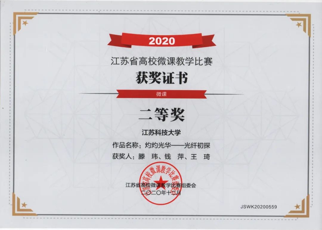 以立德树人为中心,积极开展课程思政聚合活动,将理想信念教育贯穿于人才培养全过程。滕玮、吴健康老师围绕专业建设主持开展“‘互联网+’背景下网络安全类课程思政研究与实践”,重塑专业课程体系与课程内容,获得江苏省教育科学“十三五规划” 2020年度重点课题立项资助。滕玮、钱萍、王琦三位老师制作的思政课程聚合微课程《灼灼光华-光纤初探》获江苏省高校微课教学比赛二等奖。