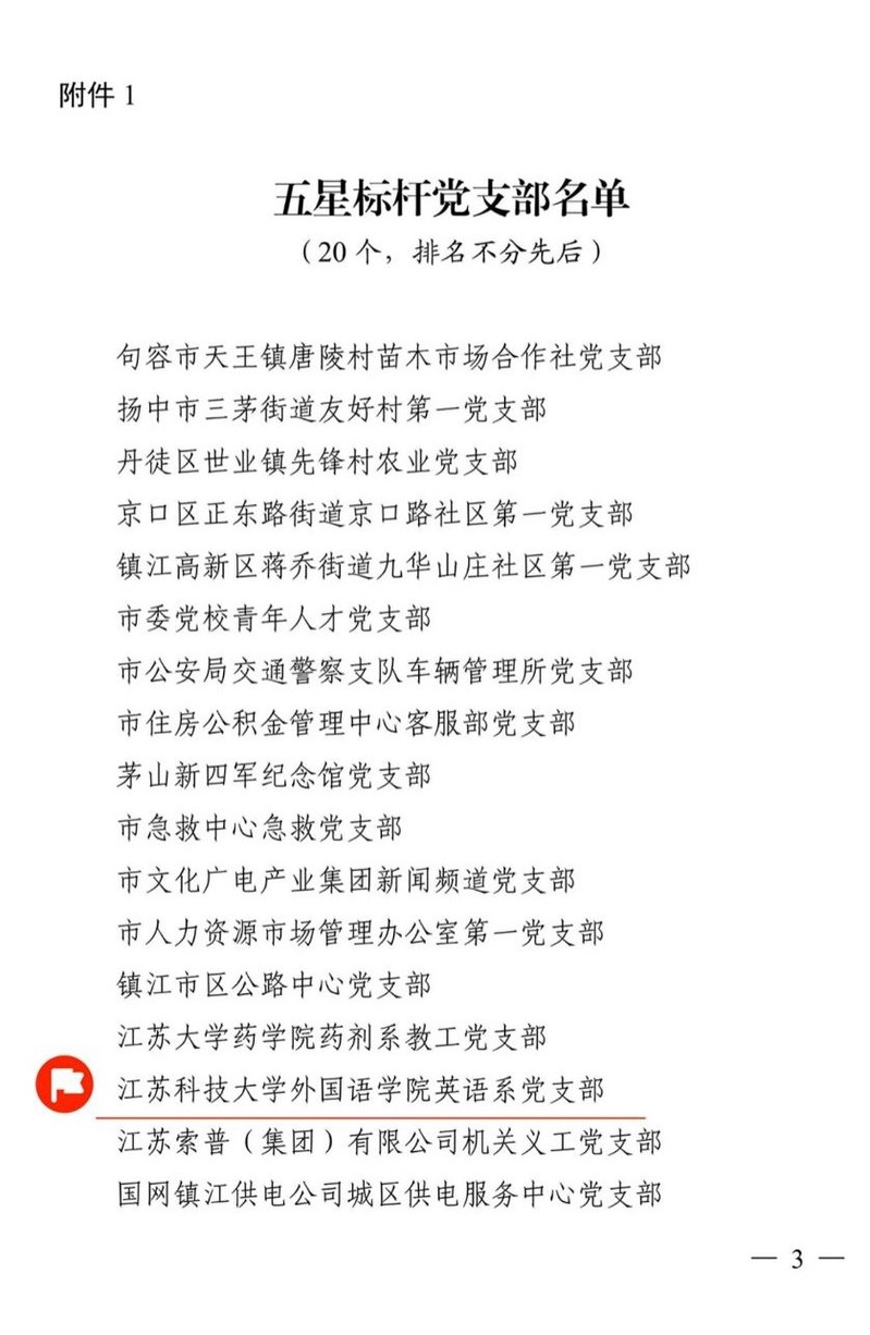 近日,外国语学院英语系党支部再创佳绩,被中共镇江市委党的建设工作领导小组命名为首批“五星标杆党支部”。这是该支部继荣获“全国党建工作样板支部”后获得的又一荣誉。
