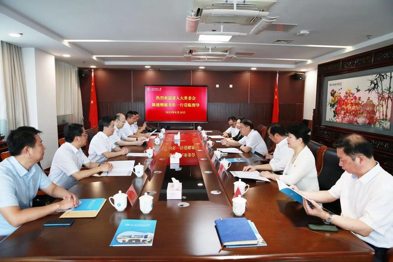 8月18日上午,江苏省人大常委会秘书长、党组成员、机关党组书记陈建刚,江苏省人大常委会人事代表联络委员会副主任王荣才一行来校调研,镇江市委常委、组织部部长、市委党校校长张娟、镇江市人大常委会秘书长胡敖成等领导陪同调研。学校党委书记周南平、校长嵇春艳、原党委书记葛世伦参加交流座谈。