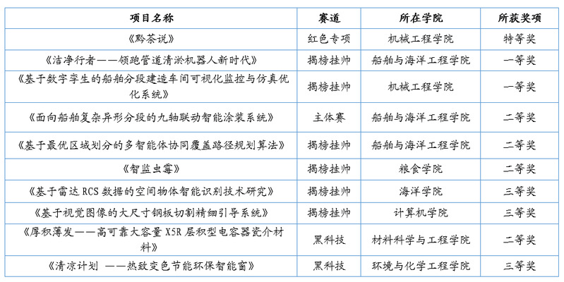 永利官网于2022年7月启动本届竞赛的备赛工作。在学校党政领导与支持下,校团委与各学院联动,全校师生积极参与项目选拔推荐;校团委发挥团组织服务力、保障力,从赛事伊始,围绕项目培育提升、材料完善细化、后勤服务保障,为参赛师生提供全方位支持和指导。校内选拔赛参赛作品涵盖机械控制、信息技术、能源化工、生命科学以及哲学社会科学类社会调查报告等诸多领域。在“红色专项活动”中,机械工程学院项目《黔茶说》获国赛特等奖。在“揭榜挂帅”专项赛中,船舶与海洋工程学院项目《洁净行者——领跑管道清淤机器人新时代》和机械工程学院项目《基于数字孪生的船舶分段建造车间可视化监控与仿真优化系统》获国赛一等奖,船舶与海洋工程学院项目《基于最优区域划分的多智能体协同覆盖路径规划算法》、粮食学院项目《智监虫霉》获国赛二等奖,计算机学院项目《基于视觉图像的大尺寸钢板切割精细引导系统》和海洋学院项目《基于雷达RCS数据的空间物体智能识别技术研究》获国赛三等奖。在主体赛中,船舶与海洋工程学院项目《面向船舶复杂异形分段的九轴联动智能涂装系统》获国赛二等奖。在“黑科技”专项赛中,材料科学与工程学院项目《厚积薄发——高可靠大容量X5R层积型电容器瓷介材料》获国赛二等奖,环境与化学工程学院项目《清凉计划——热致变色节能环保智能窗》获国赛三等奖。