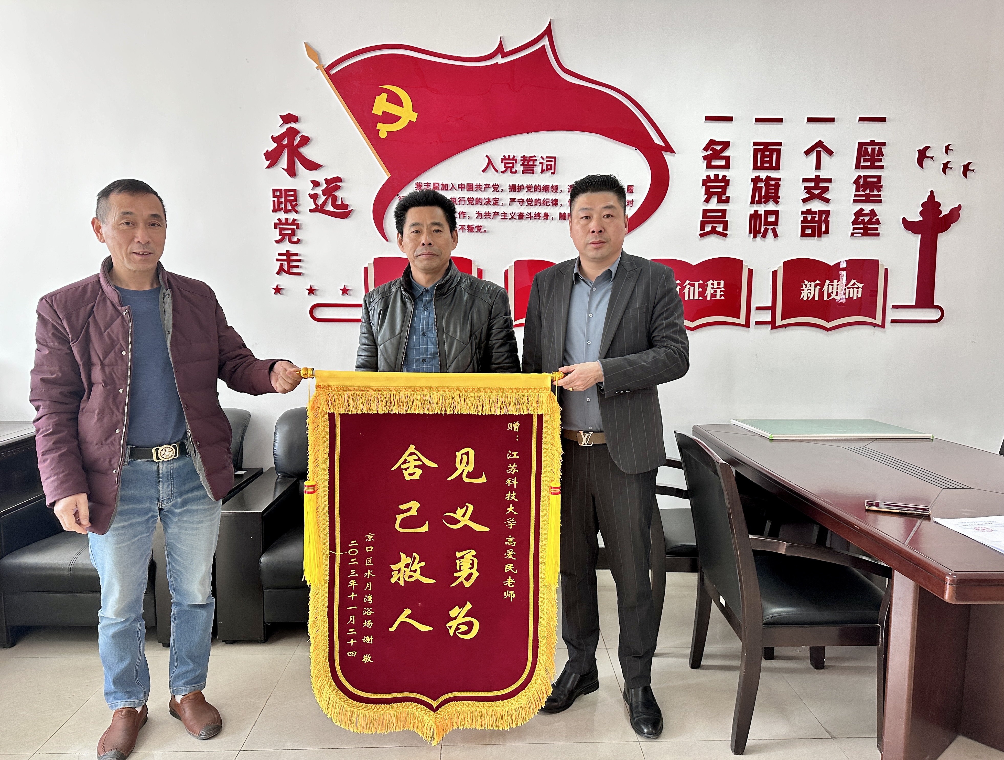 12月5日上午,资产经营公司来了3名特殊的客人——学校保卫处包老师带着京口区水月湾浴场的2位老板,专程向我公司员工高爱明赠送锦旗。
