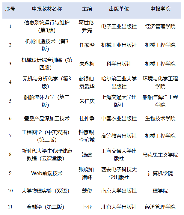 近日,江苏省教育厅公布了“十四五”普通高等教育本科省级规划教材及推荐国家级教材结果,永利官网共有11部教材入选省级规划教材。其中,《信息系统运行与维护(第3版)》《机械制造技术(第3版)》《机械设计综合训练(第四版)》和《无机与分析化学(第3版》等4部教材被推荐申报教育部“十四五”普通高等教育本科国家级规划教材。