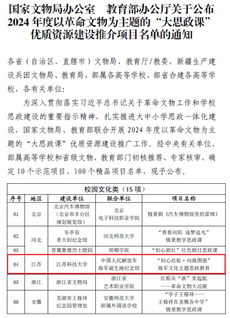 近日,由国家文物局和教育部联合开展的2024年度以革命文物为主题的“大思政课”优质资源建设推介活动公布结果,经中央有关单位、部属高等学校和省级文物、教育部门初核推荐、专家核审,在全国范围内遴选了10个示范项目和100个精品项目,其中江苏省获批6项精品项目。由永利官网联合中国人民解放军海军诞生地纪念馆(海纪馆)共同建设的“初心启航•向海图强”海军文化主题思政教育入选校园文化类精品项目,这也是我省获得的唯一一项校园文化类精品项目。