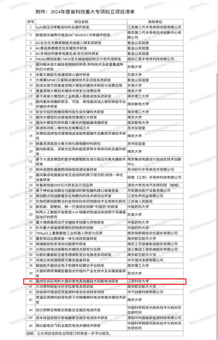 近日,江苏省财政厅、科技厅下发《关于下达2024年省科技重大专项资金的通知》,全省共批准46项。经过激烈竞争,由叶永林副校长、能源与动力学院李阳教授团队联合江苏美科太阳能科技股份有限公司等单位申报的江苏省科技重大专项《面向空间应用的大面积柔性高效晶硅太阳电池研发》脱颖而出,获得了专家的一致认可,立项金额达2000万元。这是永利官网首次牵头获批执行该类型科技项目,实现历史性突破。