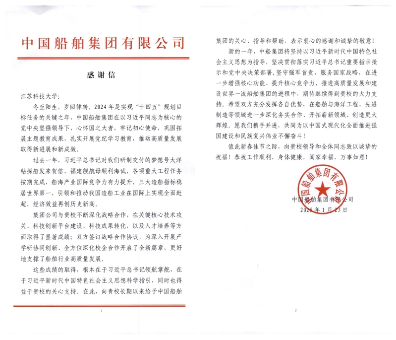 中国船舶集团有限公司在《感谢信》中也向学校全体师生员工致以诚挚的新春祝福。