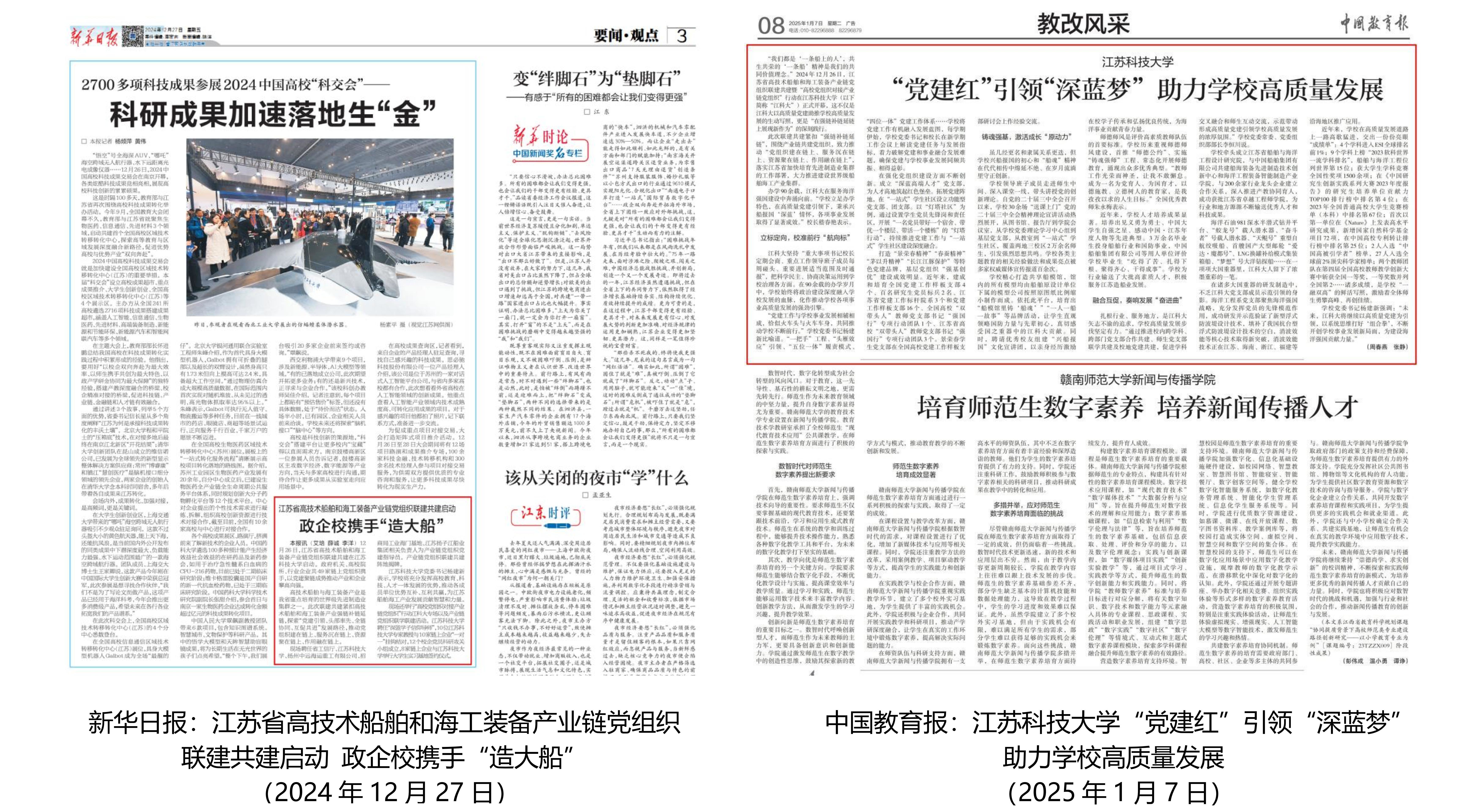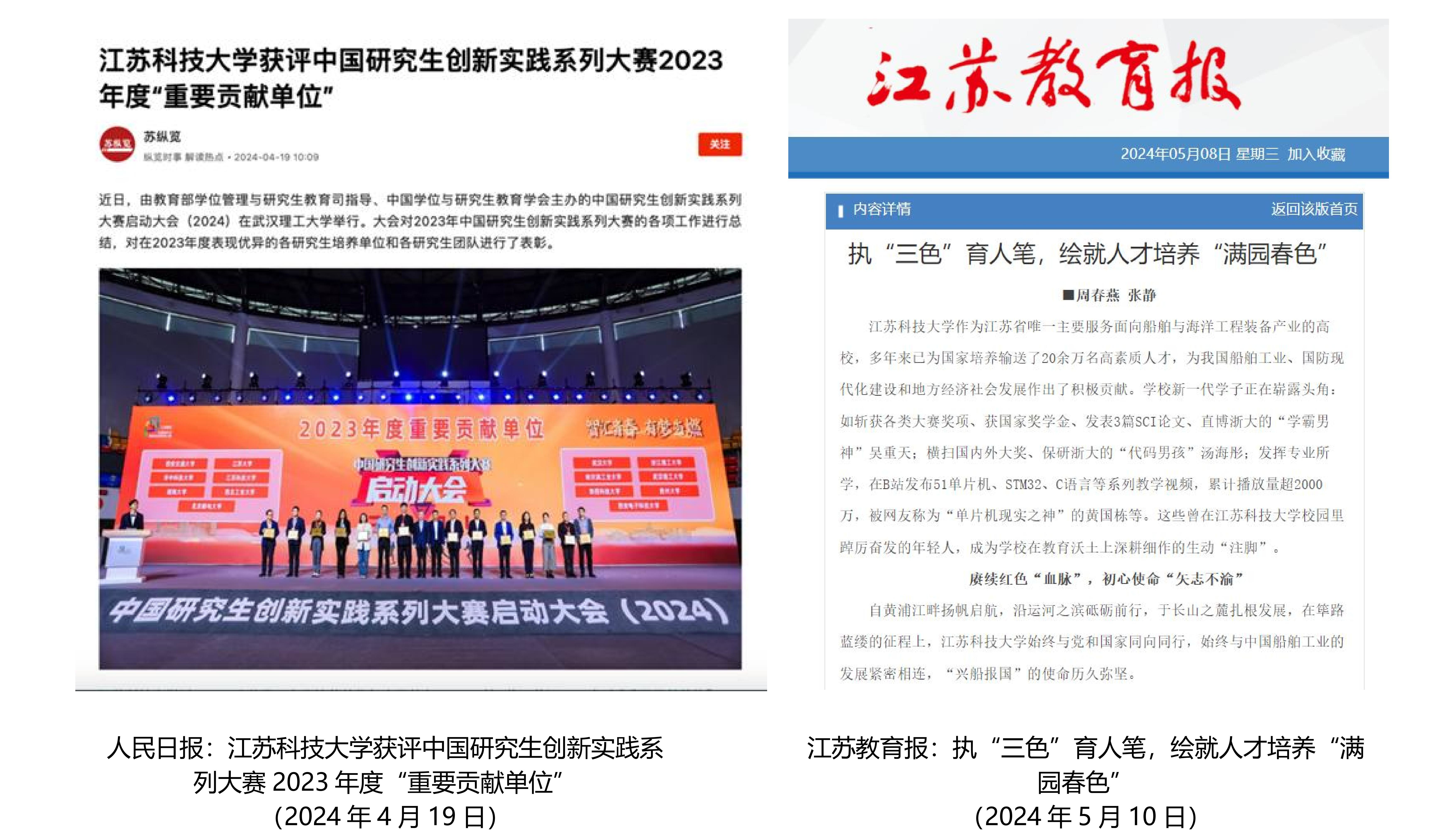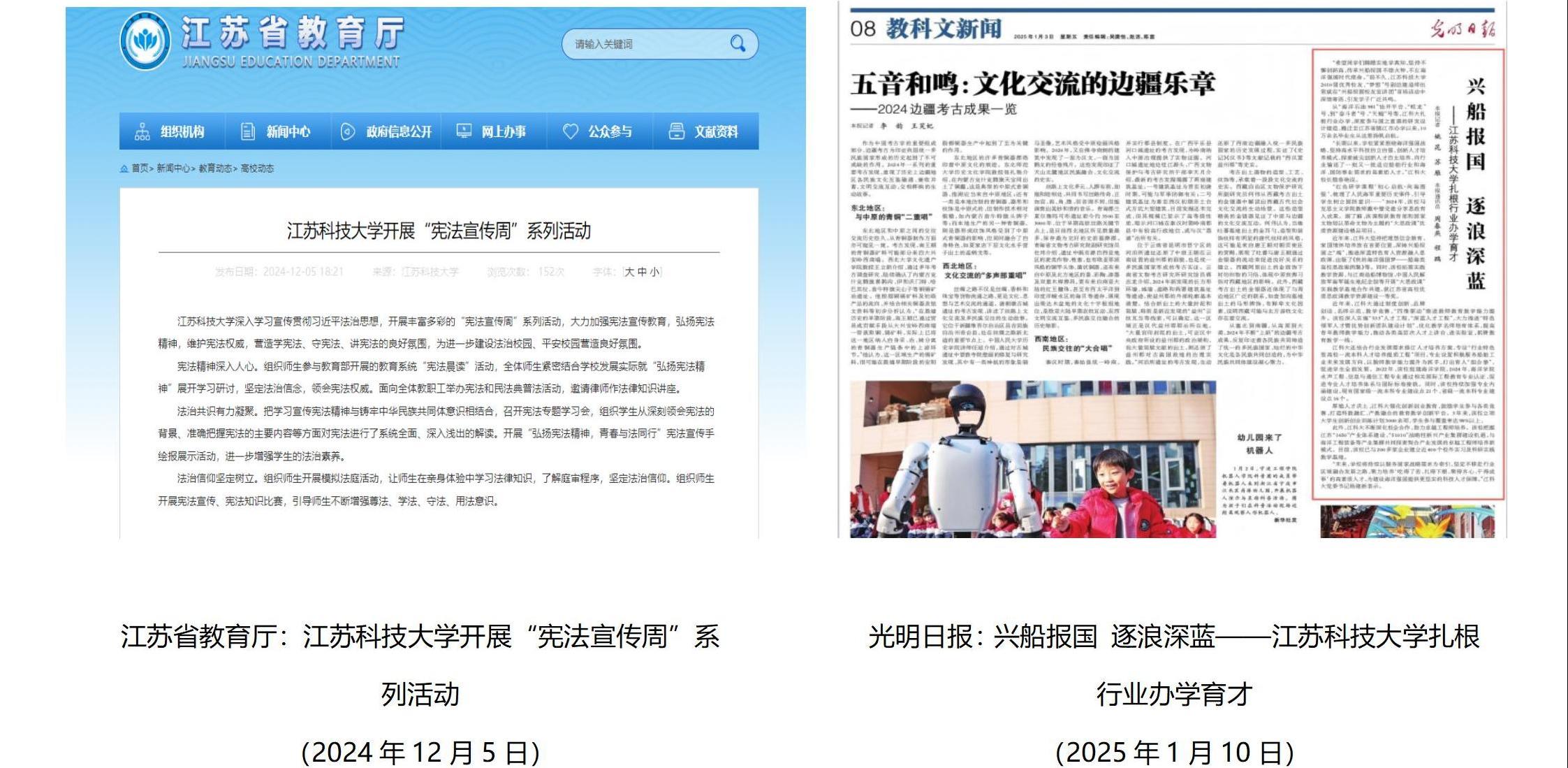 中央电视台、央视新闻多次报道学校深化产教融合,服务船舶海工产业科技创新;中国船舶报、新华日报、江苏科技报等媒体深度报道学校办学90周年,校史馆揭幕开馆;人民日报、新华社、科技日报等深度报道学校首次以第一单位在《Nature》发表研究论文,新华日报跟进报道该成果落地转化动向;新华日报深度报道学校科技助力国产首艘大型邮轮建造;中国船舶报、新华日报、江苏省教育厅官网等报道学校牵头江苏省高技术船舶和海工装备产业链党组织联建共建;中国新闻网报道学校趣味蚕桑课程受学生热捧;与央视网共创《我的大学超酷》播放量超百万……