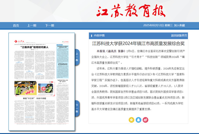 近年来,江科大着力推进人才强校战略,提升科研质量,2024年先后制定出台《304am永利集团官网教师能力素质水平提升行动计划》和《304am永利集团官网“首席科学家工程”实施办法》,在高层次人才引进培育和重大科研成果攻关方面取得新突破。2024年,该校新增国家级人才11人次、省部级重要人才19人次,1人获评全国优秀教师;获批国家自然科学基金项目73项,首次获批外国资深学者项目1项、外国优秀青年学者项目1项以及区域创新发展联合基金重点支持项目1项;新增科技部重点研发计划项目2项,新增其他省部级项目41项。一系列成果为学校高水平大学建设及镇江高质量发展提供了重要支撑。