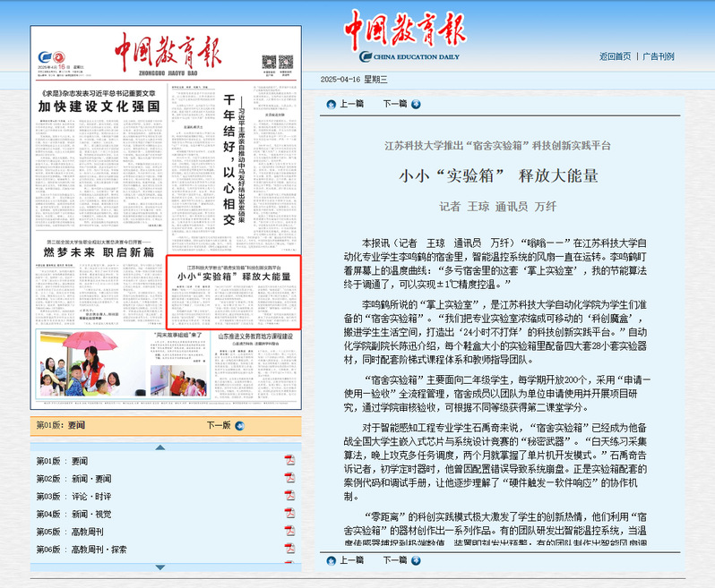 4月16日,中国教育报头版要闻报道永利官网自动化学院“宿舍实验箱”科技实践平台,创新人才培养举措。近年来,自动化学院积极搭建“宿舍实验箱”,打造育人“芯”空间,把专业实验室“装”进箱子,学习场所从“课堂”延伸向“宿舍”。
