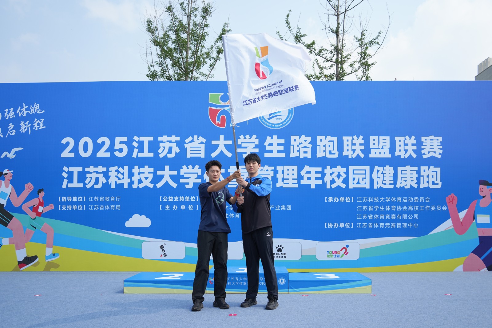 江苏科技大学男子篮球队李陈同学手持象征着江苏省大学生路跑联盟联赛精神传承的旗帜上台,把见证了江科大赛场上的热血拼搏的旗帜传递给了南京航空航天大学学生代表、“青春领跑员”柏广宁。