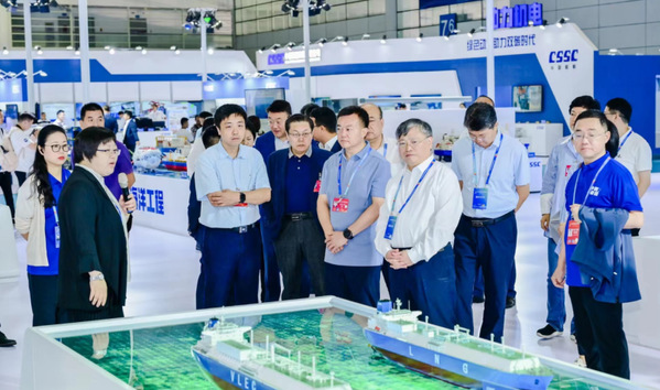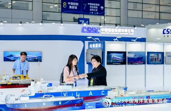 朱彦(右一)在海事展上讲解船型特点