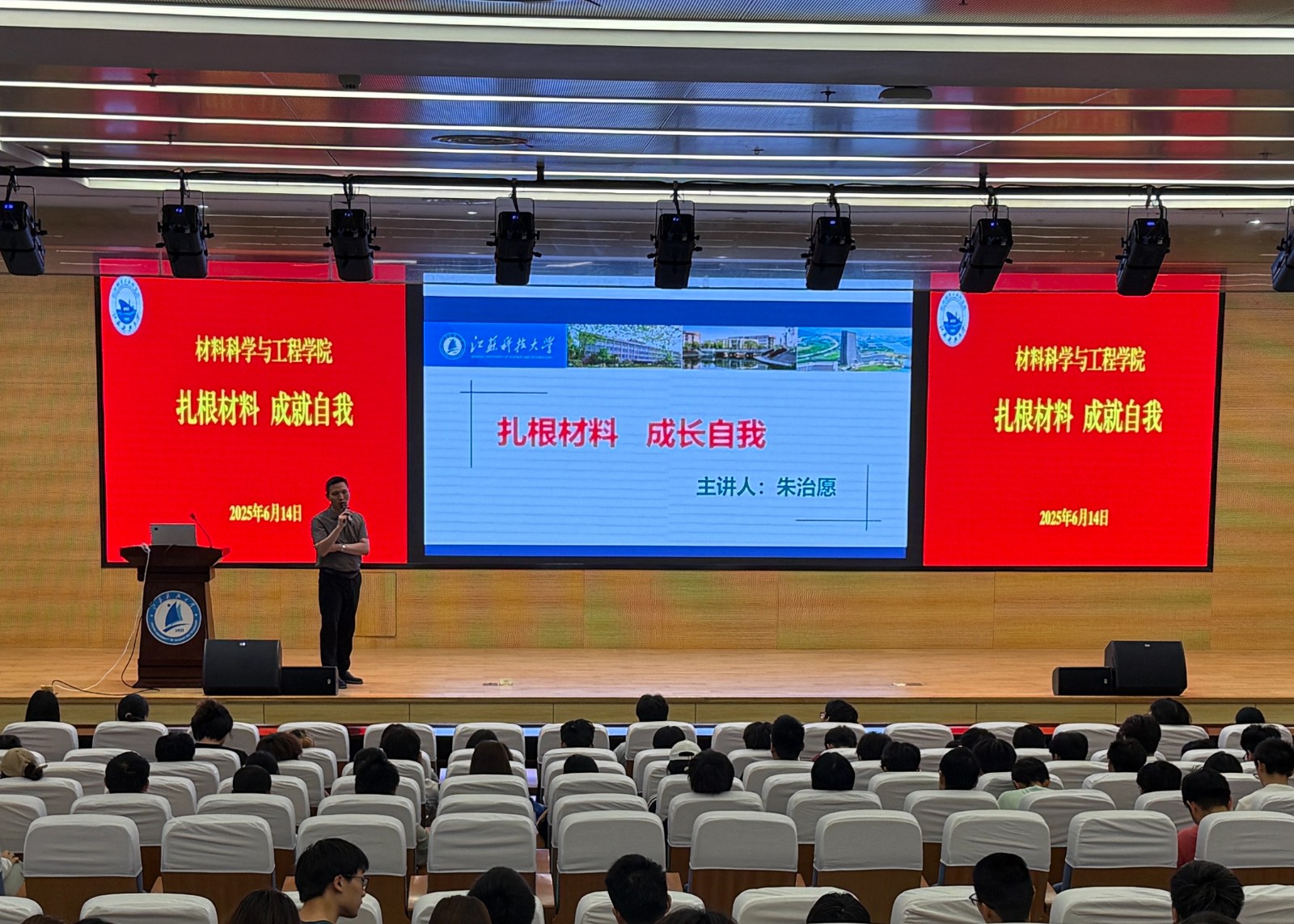 为帮助2024级材料大类本科生深入了解材料类各专业特色和就业前景,更好地做好专业选择和规划,6月15日下午三点材料学院金属材料工程专业邀请河南省科学院特聘研究员、河南省科学院材料研究所副所长兼总工程师朱治愿研究员,在图书馆105报告厅为2024级材料大类本科生做了题为“扎根材料、成长自我”的专题讲座。材料学院金属材料工程专业负责人陈洪美、2024级材料类专业辅导员王远杰老师参加了本次讲座。
