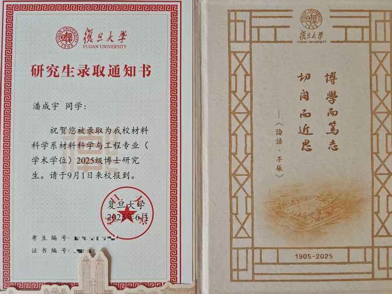 2025年7月, 一封来自复旦大学的博士录取通知书悄然抵达镇江,收件人潘成宇。这位来自永利官网2021级材料专业的研究生用十一年的光阴完成了一场三级跳圆梦顶尖学府博士生的非凡旅程。
