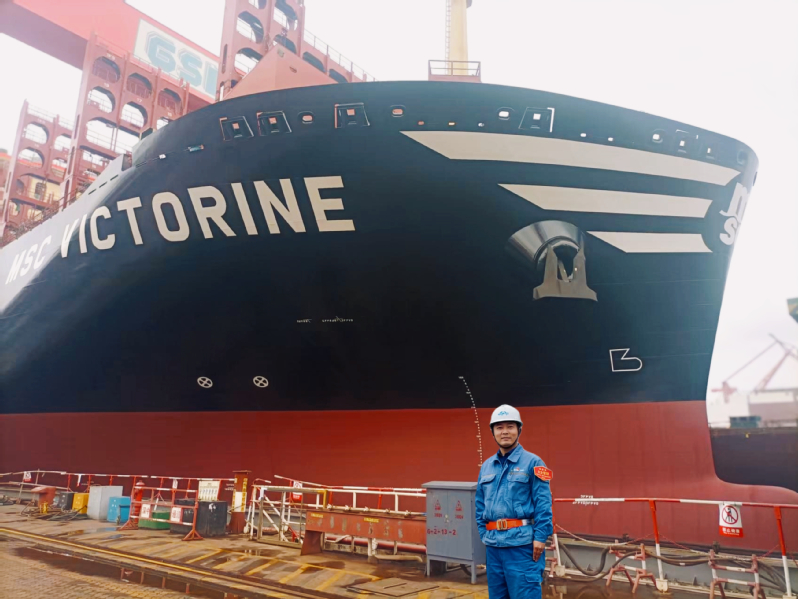 “该型船还在绿色环保方面引领了超大型集装箱船的发展潮流,各项技术指标均达到世界领先水平。”徐寅生及其团队将LNG双燃料推进系统如绿色心脏般植入船体,让每一次动力输出满足最新环保排放标准要求;世界领先的空气减阻系统节能高效,让船只在破浪征程中践行对蔚蓝海洋的温柔承诺;一台功率达到4000KW的轴带发电机仿佛能源魔术师,在船只航行时可与1台主发电机并网,满足全船的用电需求。徐寅生说:“这艘钢铁巨轮是绿色航运的先锋典范之一,我和团队把‘节能降耗,绿色造船’的理念贯穿每个细节。”