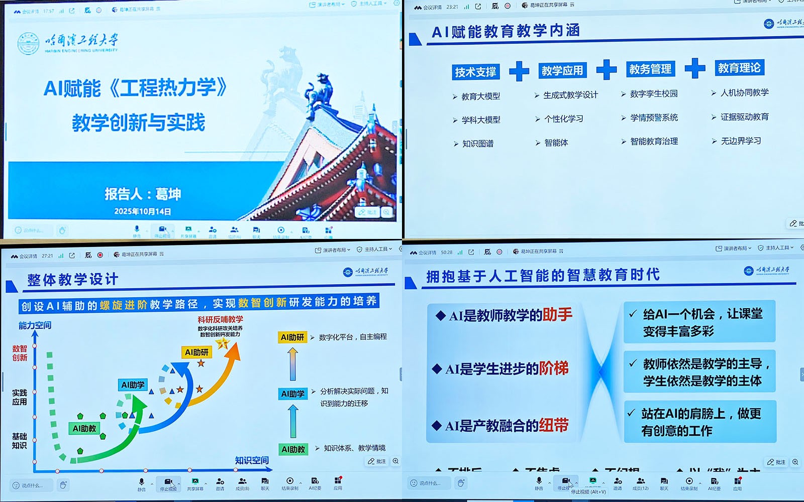 葛坤教授以《工程热力学》智慧课程建设为例,从AI技术赋能教育教学的内涵、教学总体设计理念、AI赋能面临的挑战与未来等方面深入介绍哈尔滨工程大学该教学团队多年来取得的理论研究与实践经验。特别是在应用落地层面,详细分享如何在专业课程建设中应用AI开展生成式教学设计、个性化学习、知识图谱构建和智能体训练等创新实践。活动现场,专业教师还通过在线方式与葛坤教授进行答疑互动,对AI赋能课程教学的相关问题深入探讨交流。
