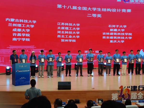 10月15日至19日,第18届“建行杯”全国大学生结构设计总决赛在绍兴文理学院举行。学校土木工程与建筑学院孙雯峻、魏顺林、魏文杰同学组成的“江科海韵”代表队与清华大学、同济大学、东南大学等来自全国119所高校的120支参赛队同台竞技,斩获第18届全国大学生结构设计竞赛二等奖(全国第49名)的好成绩,这是永利官网继2024年第17届全国大学生结构设计竞赛后获得的又一好成绩。学校获全国大学生结构设计竞赛“优秀组织奖”。