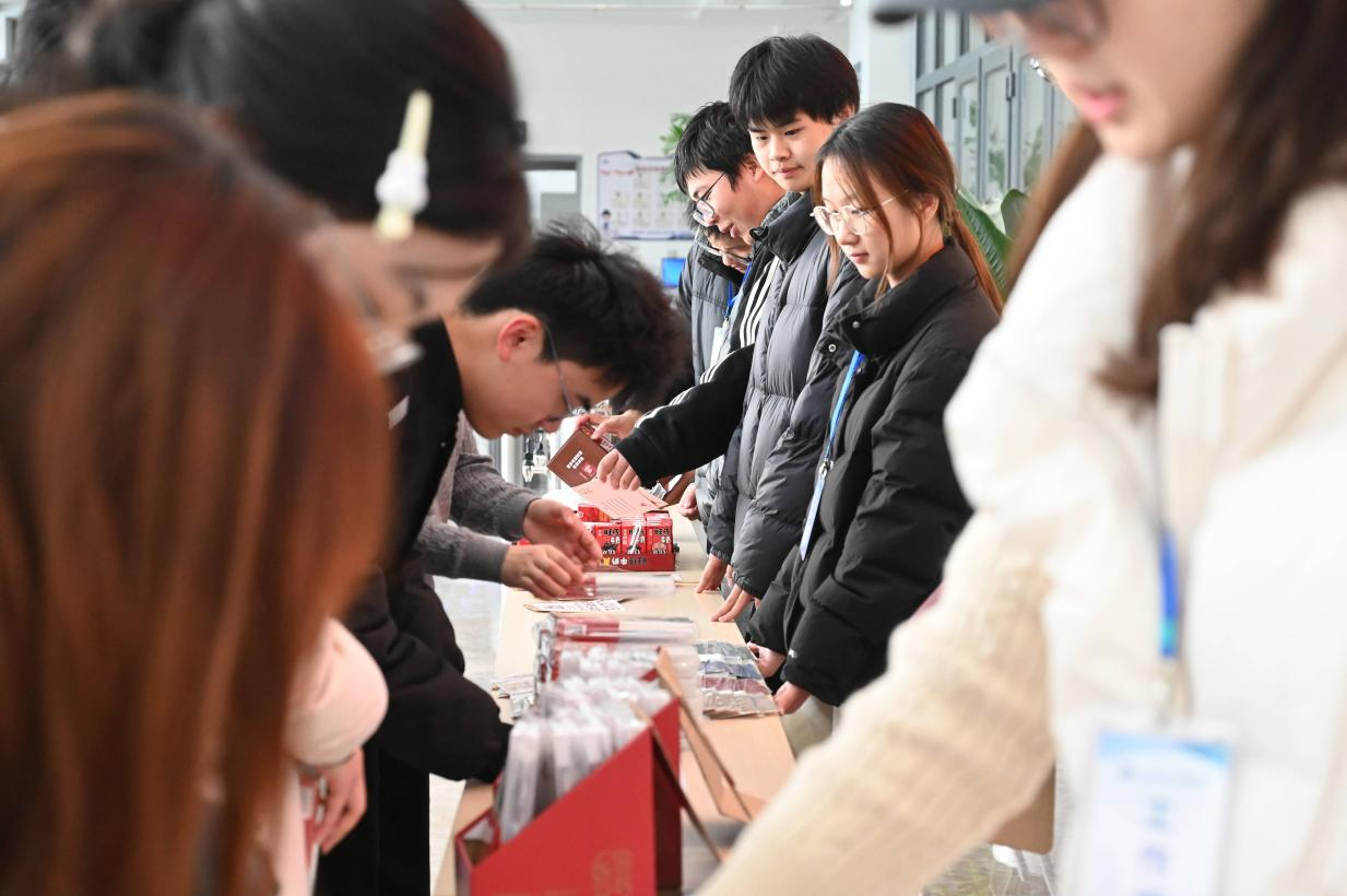 活动开始后,同学们陆续前往图书馆南门活动区,在现场工作人员引导下有序排队领取物资。一份份实用而贴心的礼品,将图书馆对学子的深切关怀转化为实实在在的支持,让在场同学倍感温暖。