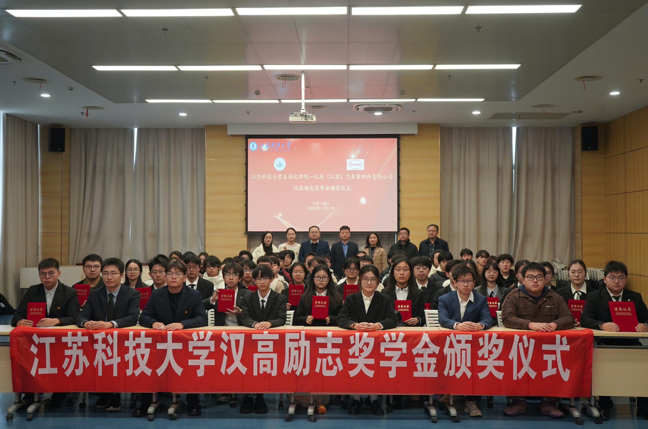 典礼伊始,郭峰代表自动化学院对汉高集团领导嘉宾的到来致以诚挚的欢迎,对汉高集团关心永利官网学生的成长与发展表达衷心的感谢。随后,陈迅宣读了《304am永利集团官网汉高励志奖学金表彰决定》,授予张迪等 17 名学生及 “磁极双擎 ——无缆管道智巡机器人” 团队 2025 年度汉高励志奖学金。