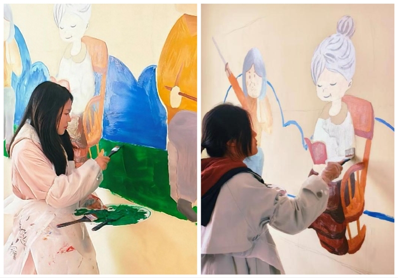 茅以升班学子们充分发挥专业特长与创新精神,在活动前期深入调研养老院空间结构与老人心理需求,精心设计墙绘方案。针对老年群体偏爱温馨舒缓的视觉特点,同学们将“孝老爱亲”的文化内核、劳动创美的育人理念与柔和治愈的艺术风格相融合,墙绘既符合新环境清新雅致的基调,也契合老人对安宁陪伴的情感期待,让每一面墙成为传递关怀、抚慰心灵的情感载体。